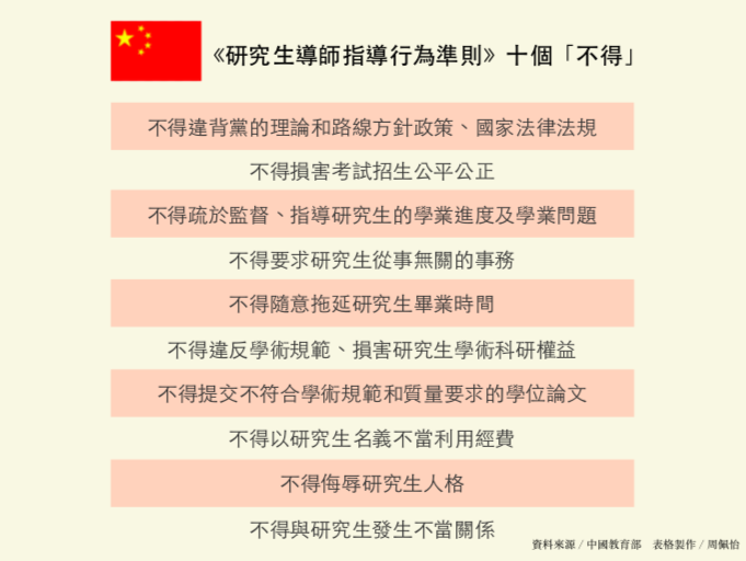 近年中國研究生與導師關係不佳而自殺的事件頻傳。中國教育部11日為此頒布包含十個「不得」的《研究生導師指導行為準則》,明確規定導師行為,盼解決目前師生關係不睦的問題。多數民眾對此表示贊成,但也點出舉報方式、確切罰則不明的缺漏。